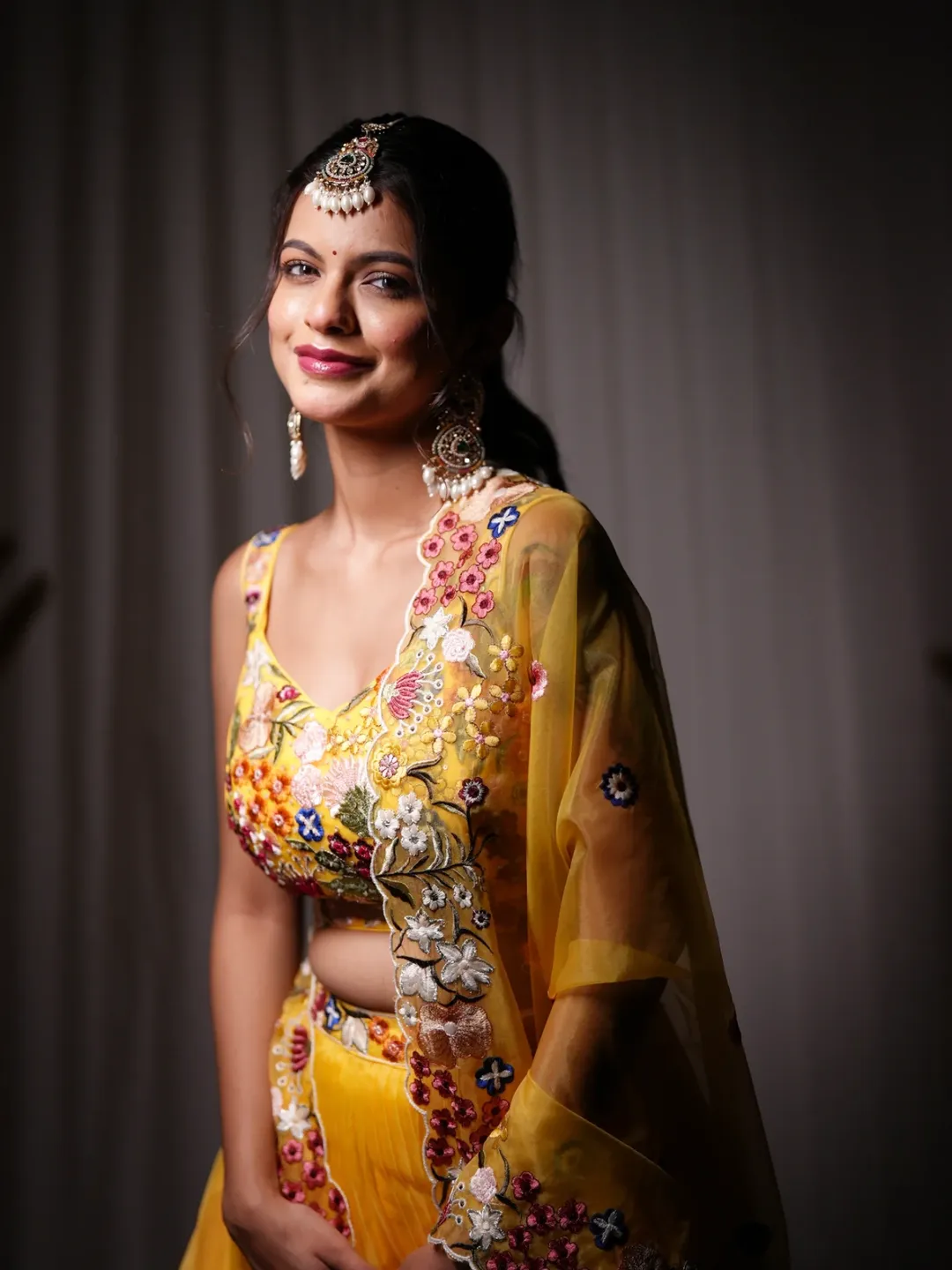 अनुश्रीने पिवळ्या रंगाचा देखणा आणि भरतकाम केलेला घागरा परिधान केला आहे.