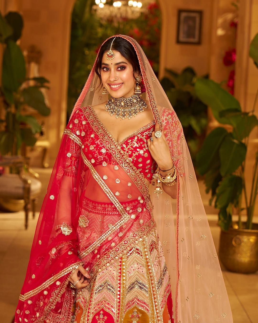 या फोटोंमध्ये जान्हवीने गुलाबी व लाल रंगाचा भरजरी लेहेंगा परिधान केला आहे.
