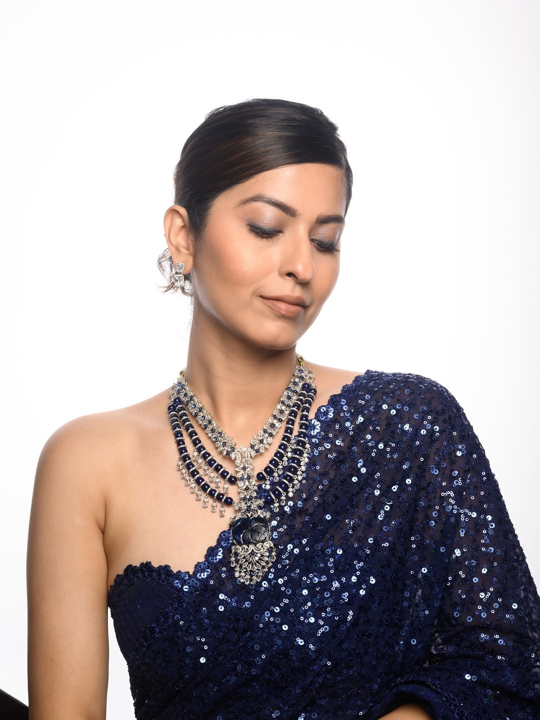 झी मराठी अवॉर्ड्स २०२५साठी अभिज्ञाने निळ्या रंगाची शिमरी साडी नेसली होती.