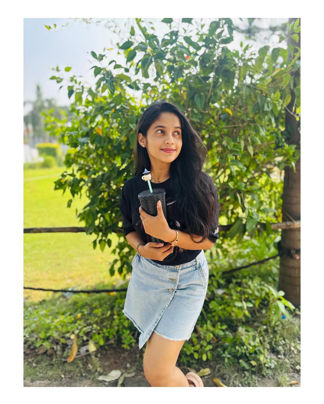 या फोटोंमध्ये प्राप्तीने काळ्या रंगाचा टॉप आणि डेनिम स्कर्ट परिधान केला आहे.