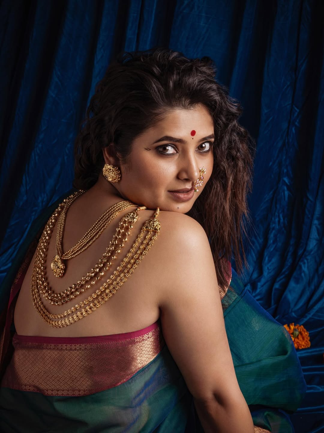 प्राजक्ताने इन्स्टाग्रामवर मोरपंखी रंगाच्या सिल्क साडीतील  फोटो शेअर केलेत.