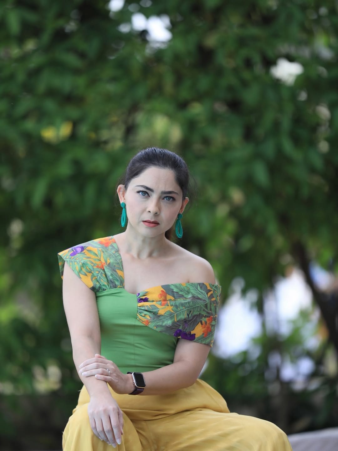 तिच्या हिरव्या टॉपवर असलेली फुलांची नक्षी या आऊटफिटला एक फ्रेश लूक देत आहे.