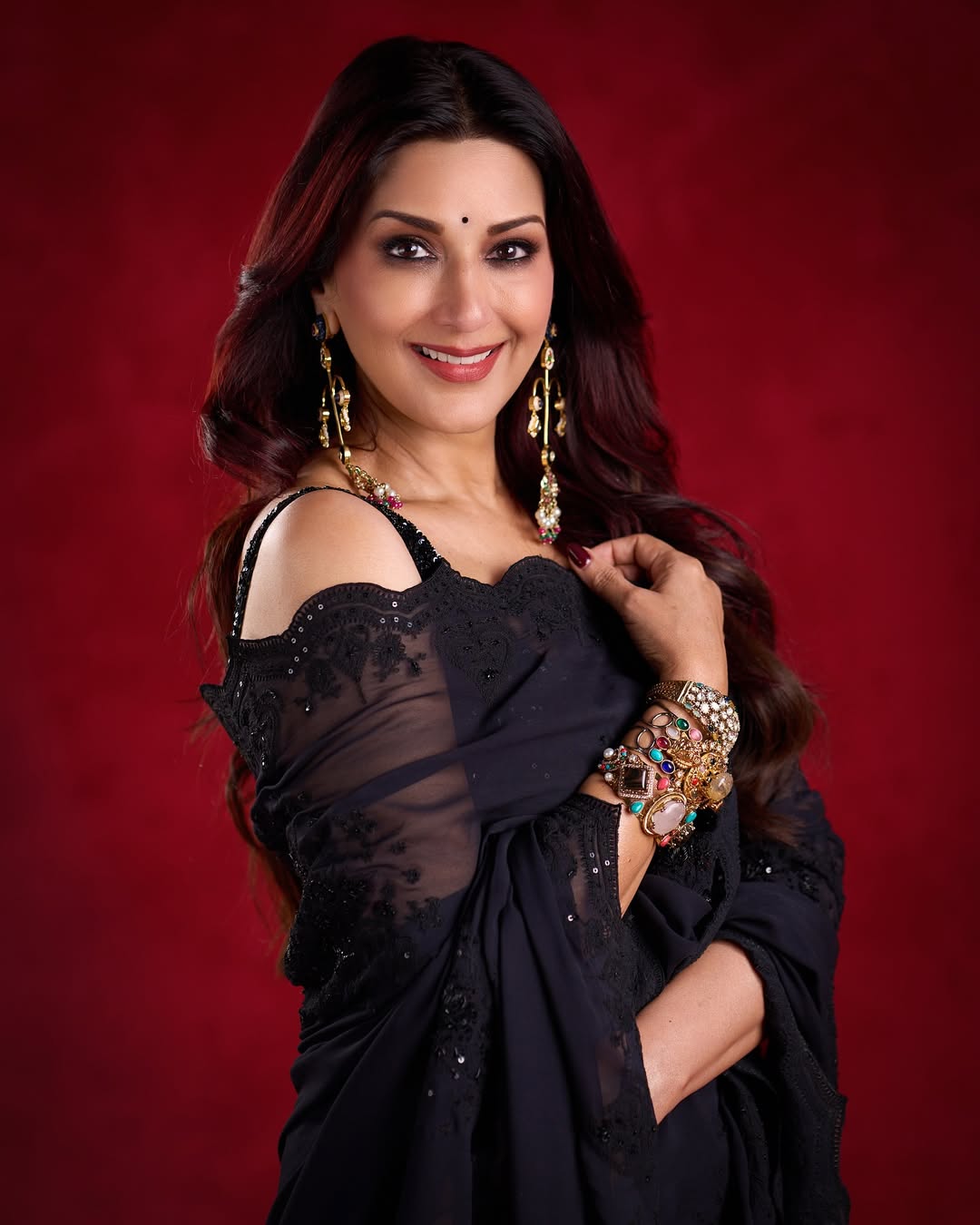 काळ्या साडीतील लूकवर सोनालीने मोठे कानातले आणि बांगड्या परिधान केल्या होत्या.